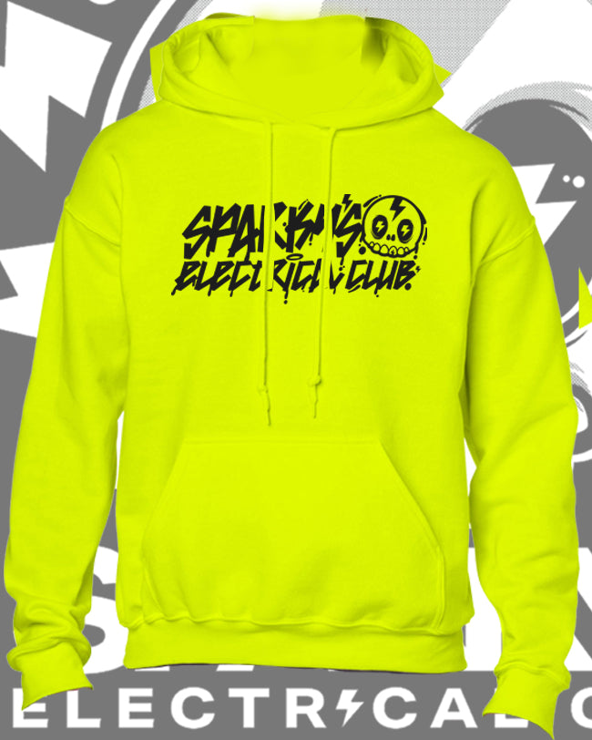 SPARKYS ELECTRICAL CLUB HOODIE - SAFETY GREEN - GRAFFITI PRINT Printed on Gildan Heavy Cotton (271gm).