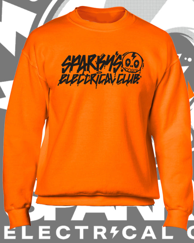 SPARKYS ELECTRICAL CLUB CREW NECK JUMPER - SAFETY ORANGE- GRAFFITI PRINT Printed on Gildan Heavy Cotton (271gm).