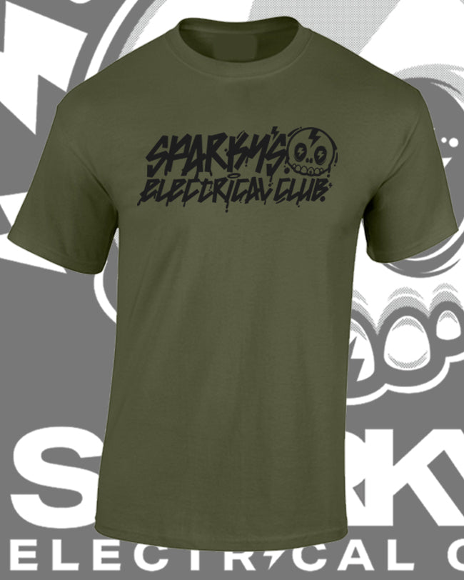 SPARKYS ELECTRICAL CLUB T-SHIRT - MILITARY GREEN - GRAFFITI Printed on Gildan Heavy Cotton (180gm).